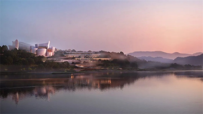 项目两侧的“五粮液世界”和“酒文化展示中心”勾勒出五粮·东方酒谷的整体形态,建筑如人造峡谷般徐徐升起,蜿蜒穿过基地,融入自然峡谷,一直延伸到岷江。溪水在建筑之间流动,跟随着故事讲述的脉络,将五粮液园区与河流、城市及世界连接在一起。