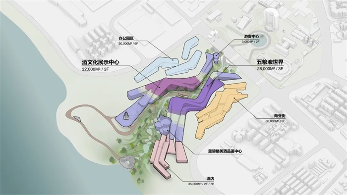 基地上设有多元化的景观路径系统,让人们自由探索周围的自然、历史文化遗迹和当代建筑。酒谷景观路径、历史文化遗迹路径和滨江观光路径将“五粮液世界“和”酒文化展示中心“连接到酒店、商街和办公园区,从而形成完整、系统、多元化的园区。