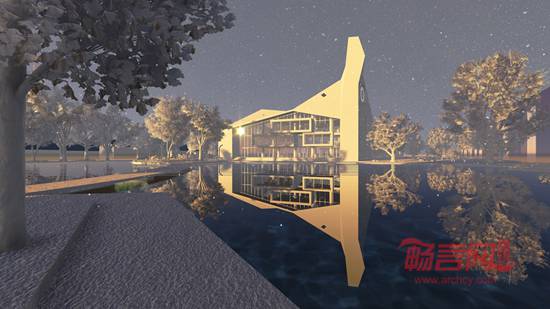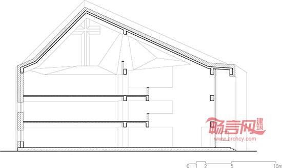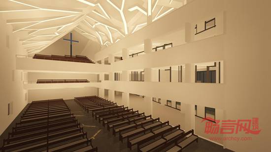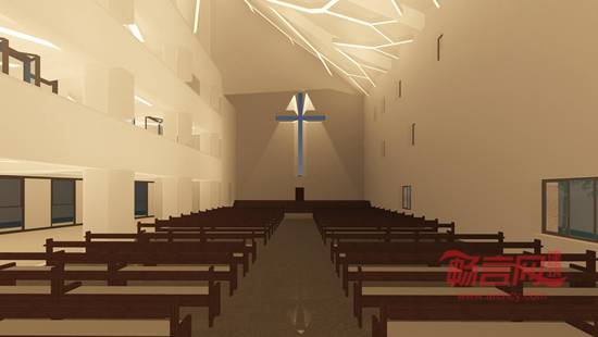 教堂西侧为一个景观公园和一个湖区,故在教堂西面公共空间使用双层玻璃墙完全打开,使得西侧景观面视线通透,将景观引入到教堂聚会厅内部。教堂的内部空间尽可能满足聚会空间的最大化,以便能够容纳教会的大量聚会人群及今后会增加的人群。