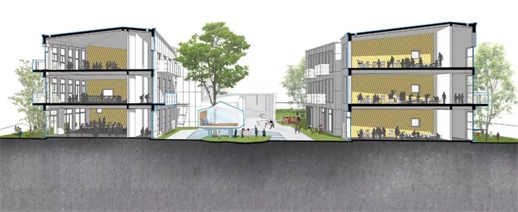 利用自然来解决后场的高差,这与传统的“平整地面,过度保护”的方式截然相反。奔跑、攀爬、躲藏,儿童的乐园不是限定他们的行为,而是释放他们的天性。通过折板曲折的跑道,我们希望通过立体化的设计,增加小孩子的运动量,环通的跑道就能让孩子们连续不断的跑起来。利用折板跑道的高差,我们将开放式教室设置于此,用来满足教学功能的多样性,也是“寓教于乐”的一种方式。