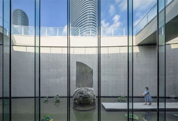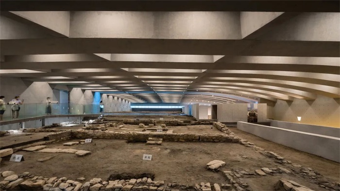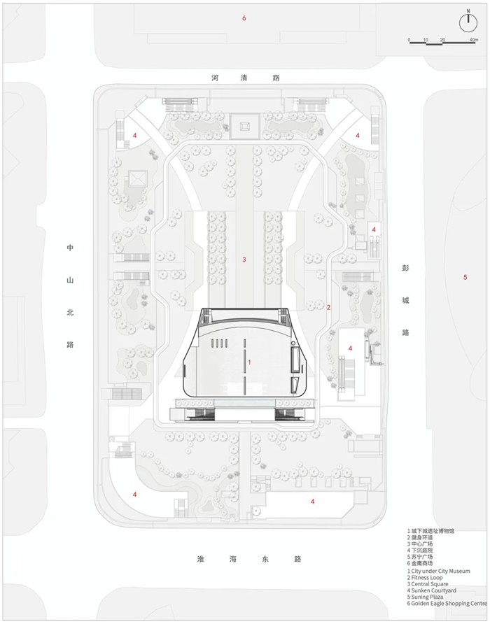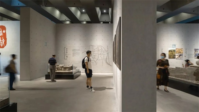 博物馆的展品是城市本身。毫无疑问,原址保护的古代城市遗址以及在附近挖掘出的单个文物是主要展品,但事实上,现代都市也是“叠城”中的重要展品。层叠的城市文脉由古今徐州共同组成。因而,博物馆并未采用常规的、螺旋上升或下降的线性路径来回应“城叠城”的历史过程,而是通过时空交错,为参观者营造出在古与今之间穿梭的空间错觉。