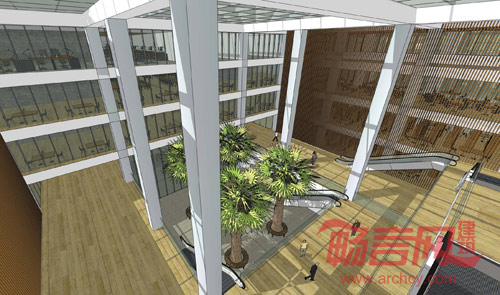 2-5层为图书馆的主体功能区,读者可以从地面通过草坡或者大台阶方便地进入二层的图书馆入口大厅,进入大厅是五层通高的阳光中庭。中厅内每个楼层轮廓不一,上下贯穿,连成一体,多组自动扶梯,交织于中庭之中,将读者送往各个楼层。