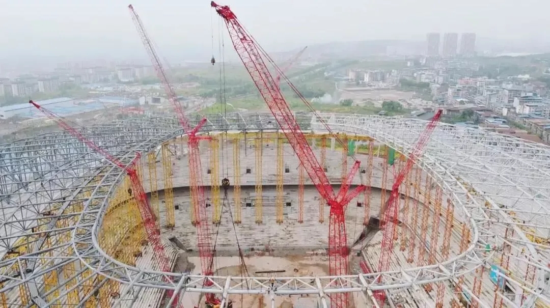 龙兴足球场是2023年第十八届亚洲足球杯重庆赛区主场馆。8月中旬,随着最后一榀环向桁架吊装完成,重庆龙兴足球场14000吨的罩棚钢结构顺利封顶,标志着足球场钢结构部分全部完成。项目从开工到钢结构封顶,仅用时13个月20天。