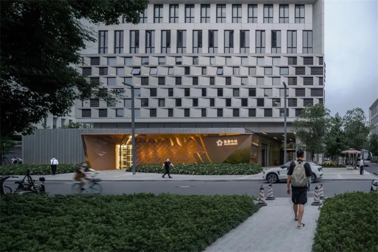 改造后的外立面采用玫瑰金不锈钢板的材质,结合钻石切割的方式,突显空间的核心概念与设计亮点。从街面远望过去,改造后的空间在原有理性的基调之上,增添了几分场所的新鲜感。设计通过打开的入口空间,最大化延伸边界,释放更多的城市界面与公共绿地场所。立面上再次强调这种张力,通过视觉上的对比与导向性集聚人气,回应城市界面的场景。