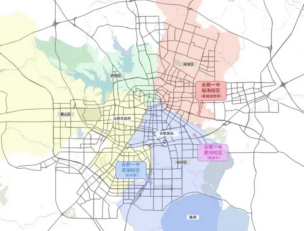 合肥一中东校区(瑶海校区)位于合肥市东部新中心。合肥东部新中心以瑶海老工业区为核心,横跨瑶海、包河、肥东三地的现代化新城区。