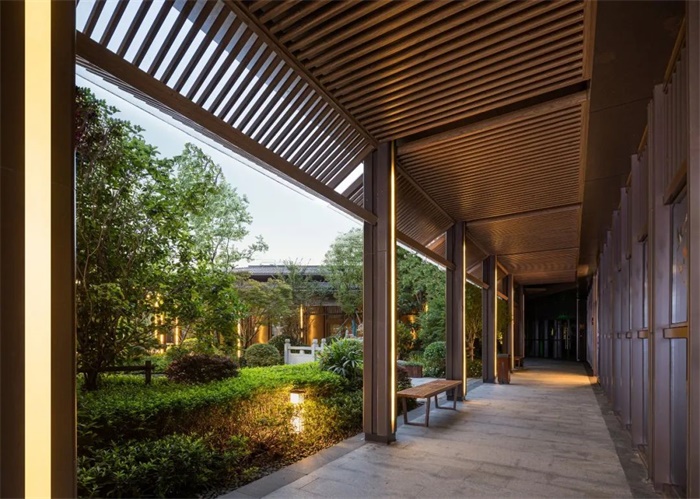江南阴雨天气比较多,因此项目通过风雨连廊联系各生活楼栋,同时将南北两头的活力及健康配套拉通,形成一条活力纽带。除了连续的“廊”,还在重要节点设置多个“亭”,成为老人们室外聚会的场所。当连廊延伸至居住楼栋处,放大尺度创造“室外门厅”,使之成为老人们共同的“宅前屋后”的交流空间。