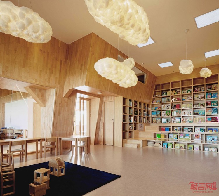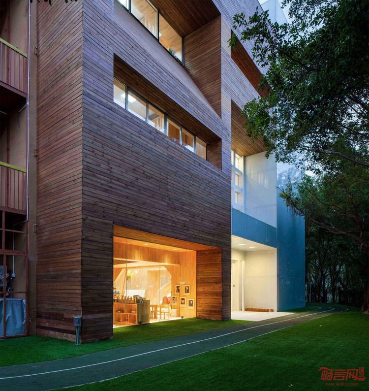 建筑立面的重新分割使该项目内部带来不同的视野,从而使整个建筑变得更为开放。 铝,防腐木,白玻等材料的使用与室内装饰材料相呼应。除此之外,该设计手法消除了封闭的感觉,同时更符合儿童的视线高度,并引入更多远处的风景和视野,使儿童,教师甚至附近街区的居民都能享受其中。