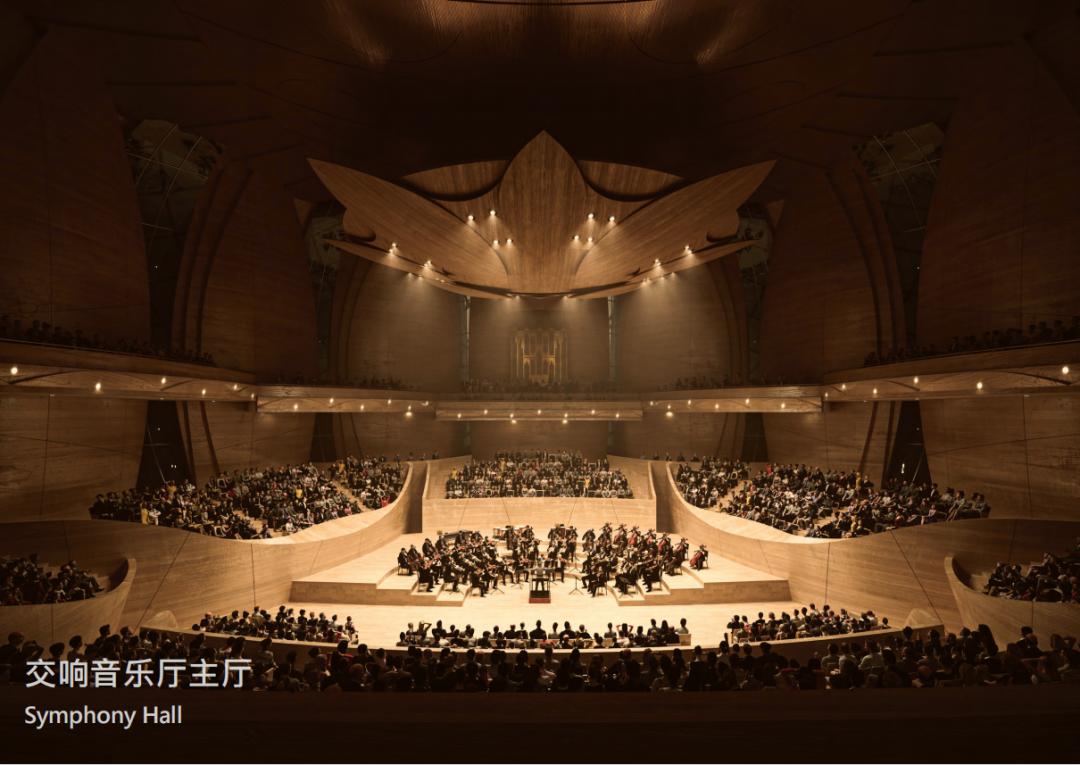 夜晚,灯光照亮,投向建筑外部整个音乐厅都会被点亮