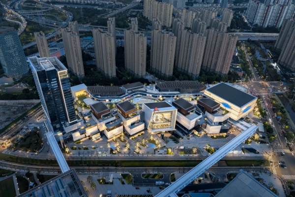 设计之初,Benoy 便深度考量项目与周边城市环境的融合度。团队借鉴南京既有的城市肌理,创新性地将建筑整体扭转45度,这一设计不仅让每一栋建筑都拥有正南北朝向 —— 既符合节能需求,又确保室内采光充足、视野无遮挡,更成功规避了紧凑体量可能形成的“屏风效应”,让建筑与城市天际线自然对话。
