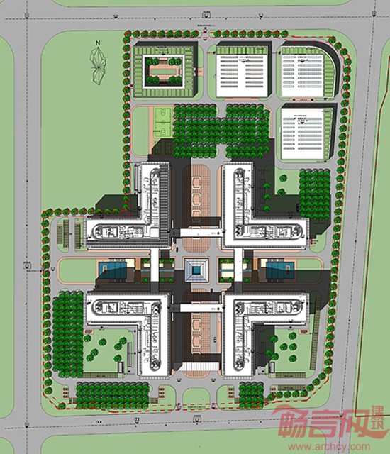 主体建筑造型为四个L型规整体型。设计将标准化工类实验室、办公室进行整合,将两部分功能垂直布置于主体建筑内。同部门联系便捷,实现高效研发。 将配套宿舍及大型/特殊实验室、仓库等分别设置在场地西北角及北侧,分区明确。