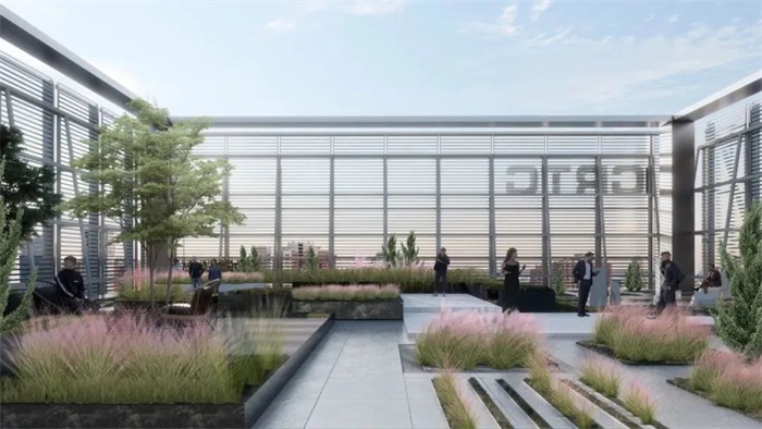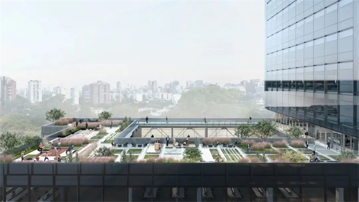 传统办公空间设计中往往仅强调室内采光质量,对办公空间景观性营造不足,设计基于巨柱结构,将超大无柱办公使用空间沿景观面展开,同时以交通服务空间为屏障,减小与相邻建筑对视影响,实现270°景观办公空间。通过立面细节精细化设计,改变传统办公建筑幕墙划分方式,采用更加人性化的横向玻璃划分,在造价不变的基础上,增加景观视野范围。