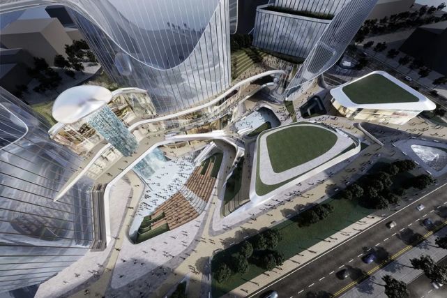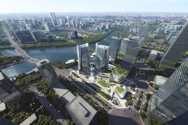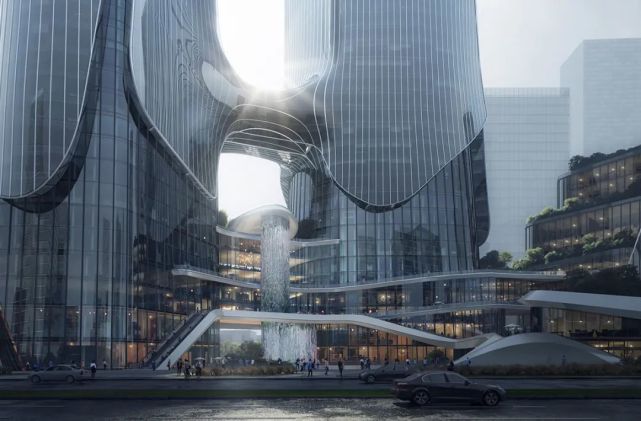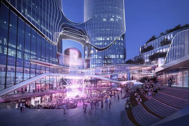 项目从成都山水取得灵感,以山水曲线勾勒城市轮廓,让空间流动,通江-接绿-连城,结合智媒参数化表皮,植入生态场景,构建立体公园,还绿于民。建筑师在设计之时, 对项目第一印象要把这城在园, 园在城中的概念表现出来。在不同的垂直层高空间中,错落布局多个室外广场,营造新经济新业态下的人文场景。