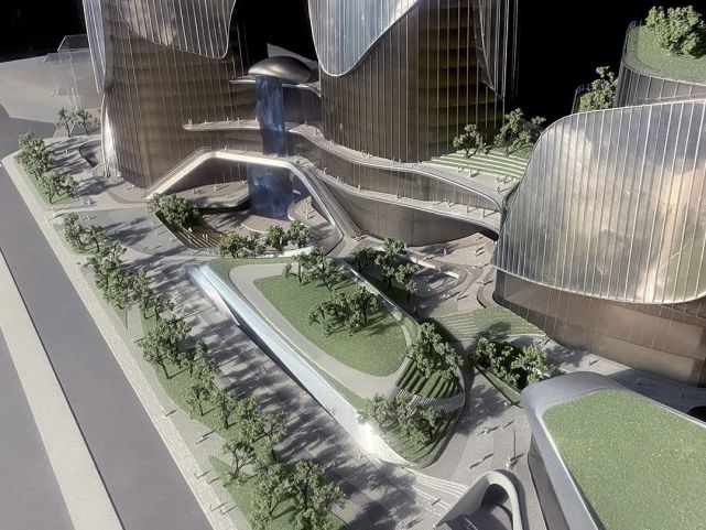 设计师以上层集约功能塔楼即每经中心双塔作为新闻制作与发布的心脏,中层展示平台展示媒体文艺影响力,涵盖音乐、喜剧、文创,灵活运用智能投影技术与游人互动,寓教育于娱乐,创造数字化自然启迪心灵,以未来姿态,走在文艺科技浪尖,结合商业,将媒产展商景五体合一,使媒体业生长周期全面空间化。