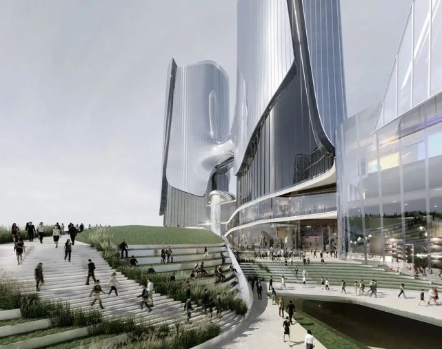 成都每经中心以智经双塔为门户,演艺展示为锚点,文艺交汇。以下沉广场结合商业街及TOD站点,站城一体。这拥有优雅天际线的地标群体,正是为大众而设之未来交流地,双塔交互而生,构建知识交流、文艺交汇、商景交互的未来城市。