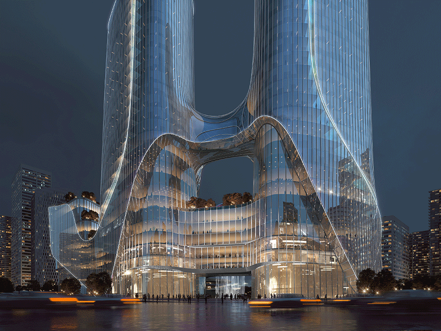双塔象征着每经中心对走在行业领先地位及发挥全球影响力的宗旨和体现,以成都山水为灵感,双塔如山峰壮丽挺拔,两者形态相配,左辅右弼,中间以拱廊式两度连接,寓山水于现代建筑,以开天奇洞迎宾展示。双塔前瞻性的未来风格流线型设计突显不凡地位,立面具视觉冲力, 却以经济模块化理性处理,实现经济落地与美学平衡。