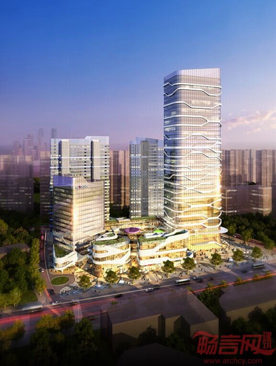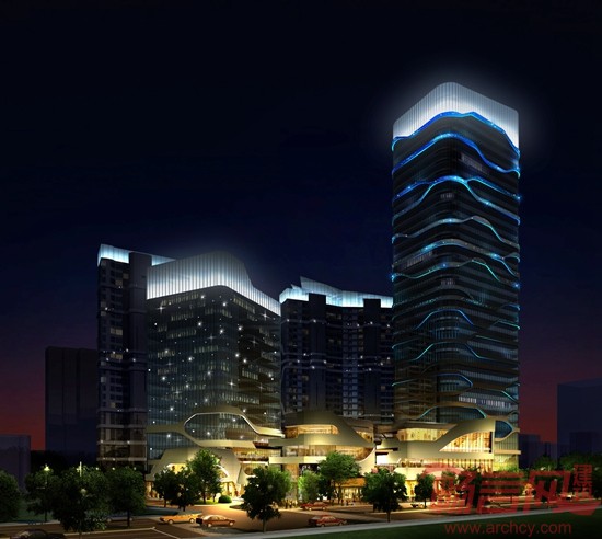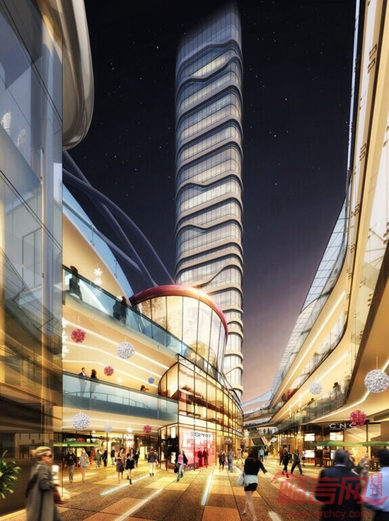 以商业岛为核心,透过涟漪般的波纹散开的商业布局,以装置艺术建筑为商业创造主题。以水波纹为设计理念,以水的流转、水的渗透、水的交融、水的永续为立面设计思路,将商业、办公、公寓式酒店、住宅立面结合设计,达到立面水波纹的延续。
