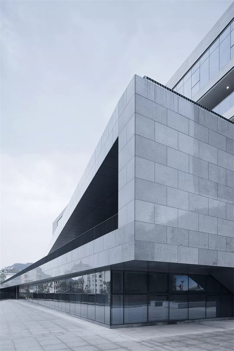 建筑采用黑白灰色系以体现开化山水城市及中国山水画卷中的具有人文意境的建筑色调,待山中云雾缭绕时,建筑的基座消隐在山中,上部灰白色的盒子犹如漂浮在山中,同时站在不同的平台上观远处山景和江景,形成了一幅建筑与周边山体和天空融为一体的感觉。