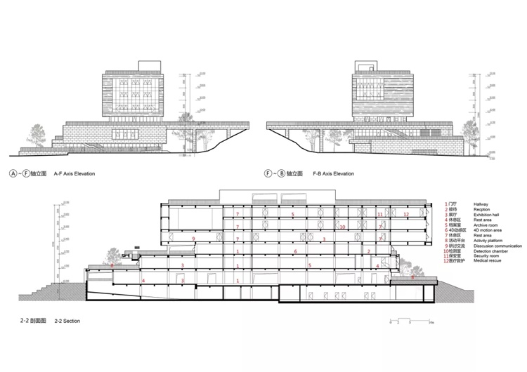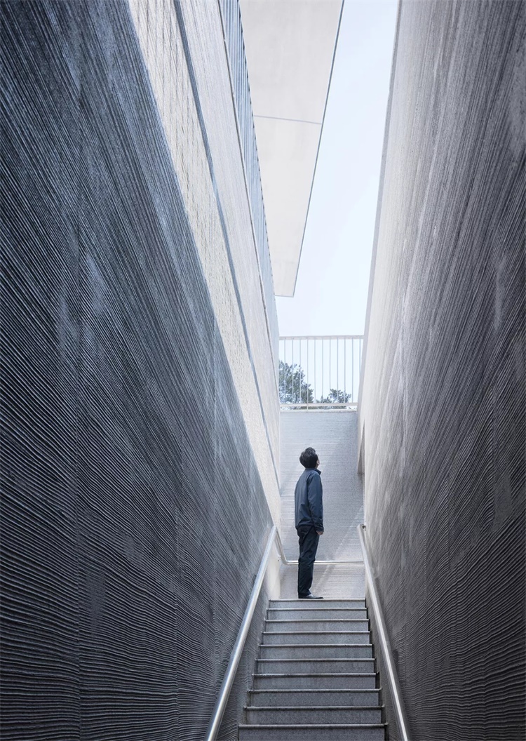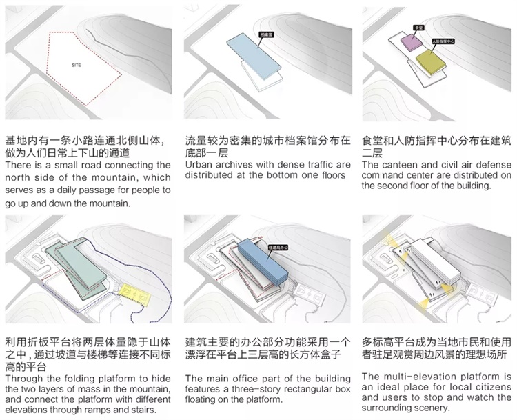 基地内有一条小路连通北侧山体做为人们日常上下山的通道,设计为了充分尊重现状场地和诸多外围的景观资源,提出了不同标高平台的解决方案。即将人流量较为密集的城市档案馆分布在底部一层,通过坡道与楼梯等连接不同标高的平台,犹如北侧山体等高线的延续,使下部建筑与山体自然融为一体。这不仅恢复了原有上下山通道,同时多标高平台又成为当地市民和使用者驻足观赏周边风景的理想场所。