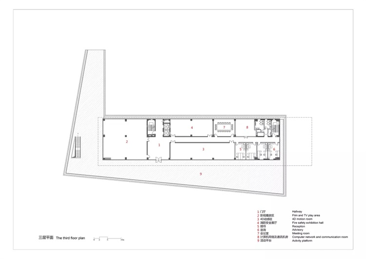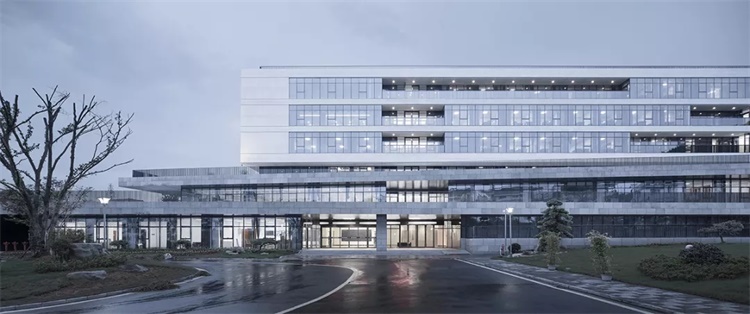 建筑主要的办公部分功能采用一个漂浮在折板平台上三层高的长方体盒子,纯粹而简洁的形体顺应南侧折板平台走势,并与北侧山体等高线平行布置;同时,盒子在东侧悬挑于三层以外约12米,使盒子与下部折板平台形成了在错动中取得平衡的一种形体组合。