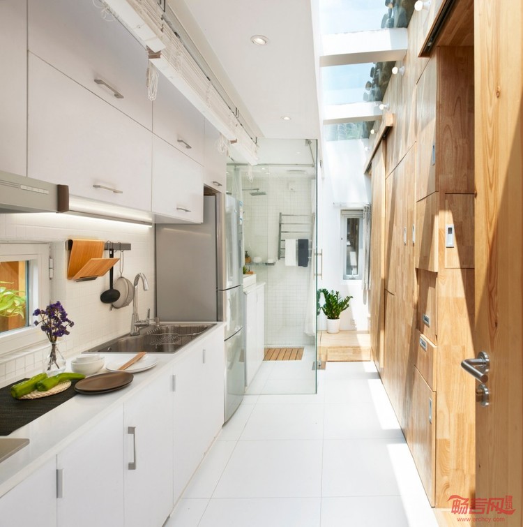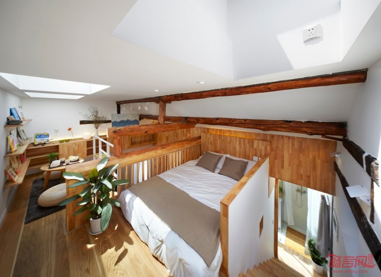 南锣鼓巷大杂院住宅改造项目在细节设计上,利用天窗解决室内因开窗面积小采光不足的问题,同时也不占用墙面的收纳空间。