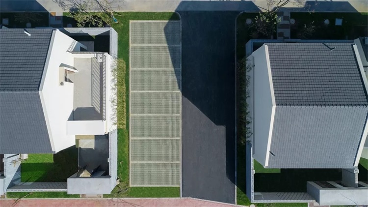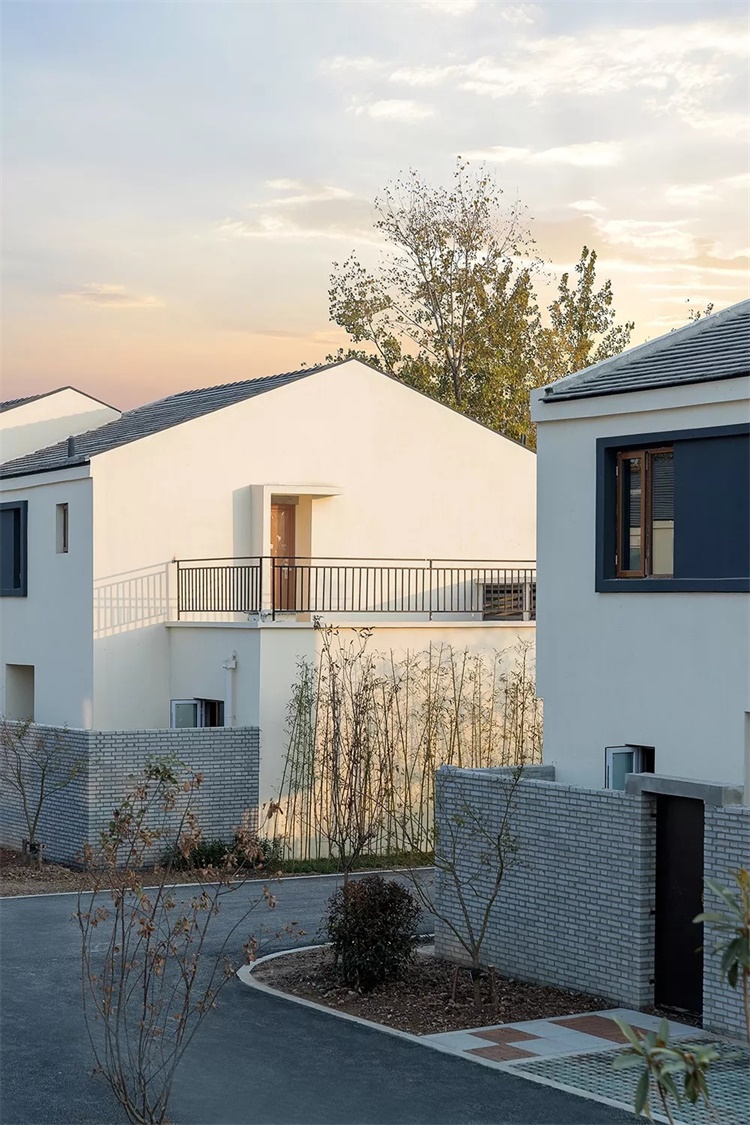 造型上,如何用最简单的形式形成有变化的形象,是我们的思考核心。根据当地建筑风貌和平衡房屋价值,所有的住宅都是南北双坡。不同的面积户型有进深的微差可以形成屋脊的变化,少量的退台能形成天际线的张弛变化,前后微小的错动布局能让内部空间和透视发生变化。