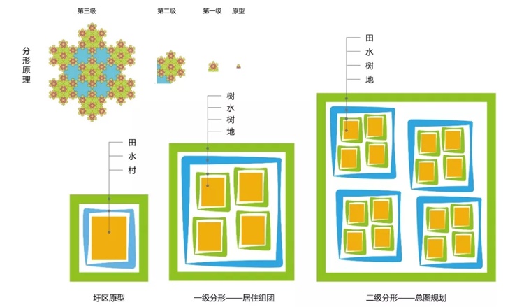 受分形的自相似结构的启发,确定了组团式供地的规划原则,分为多个居住组团,每个组团的分界是由现有的河道或道路包围而成,而当地常见的白杨树则成为住宅和分界河道或道路之间的缓冲介质,保证居住的私密性和舒适感。