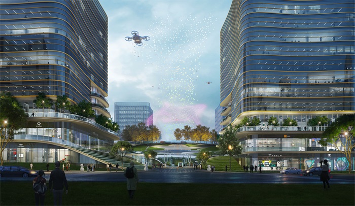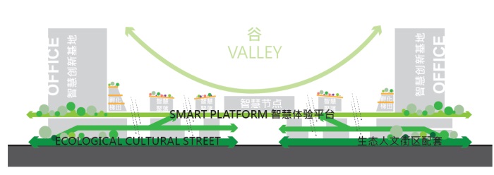 为实现全覆盖的生态人文景观,设计基于立体垂直的多维绿色空间,以四周高、中间低的地势形态搭配“内商外塔”的布局,形成犹如山谷的天际线轮廓,呼应周边环境,强化绿谷概念。高层办公塔楼布局于地块四周,并以退台形式向内延伸,形成低密度创新产业梯田,同时营造出大量户外绿色空间。并通过二层商街屋顶形成的智慧体验绿色平台,与中心为独栋办公的低层建筑自然衔接,形成由上至下、由立及外的全方位绿色空间,自然呼应重庆的立体多维城市花园特征。