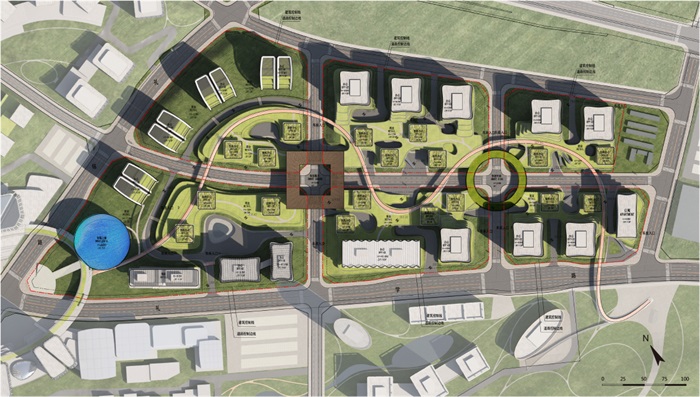 设计围绕中心的门户核心,结合地块走势构建南北向的片区服务轴以及东西向的产业发展轴,将地块划分成为一心四片区,分别对应岭、台、湖、谷、林五大山水元素。并依托地块内部的循环廊道以及地块间的连桥,构建片区慢行系统,促进全周期产业循环。中部门户核心以立体环形天桥连接多座高层办公总部,与周边地块形成有机连接的同时,塔楼错落犹如山岭,如同绽放的花蕊;周边四个地块犹如花瓣,设计结合地理特征,将其定位为科创台地、智湖小镇、孵化林园以及创新智谷。