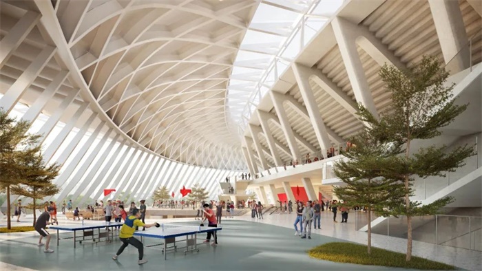 衔接原有土建条件,利用富余荷载支撑屋面。建筑、结构、装修一体化设计,罩棚采用轻盈的索穹顶膜结构,施工速度快,观赛效果好。公共平台结构外露,减除吊顶,采用单层网壳+索承网格结构展现力学美感。