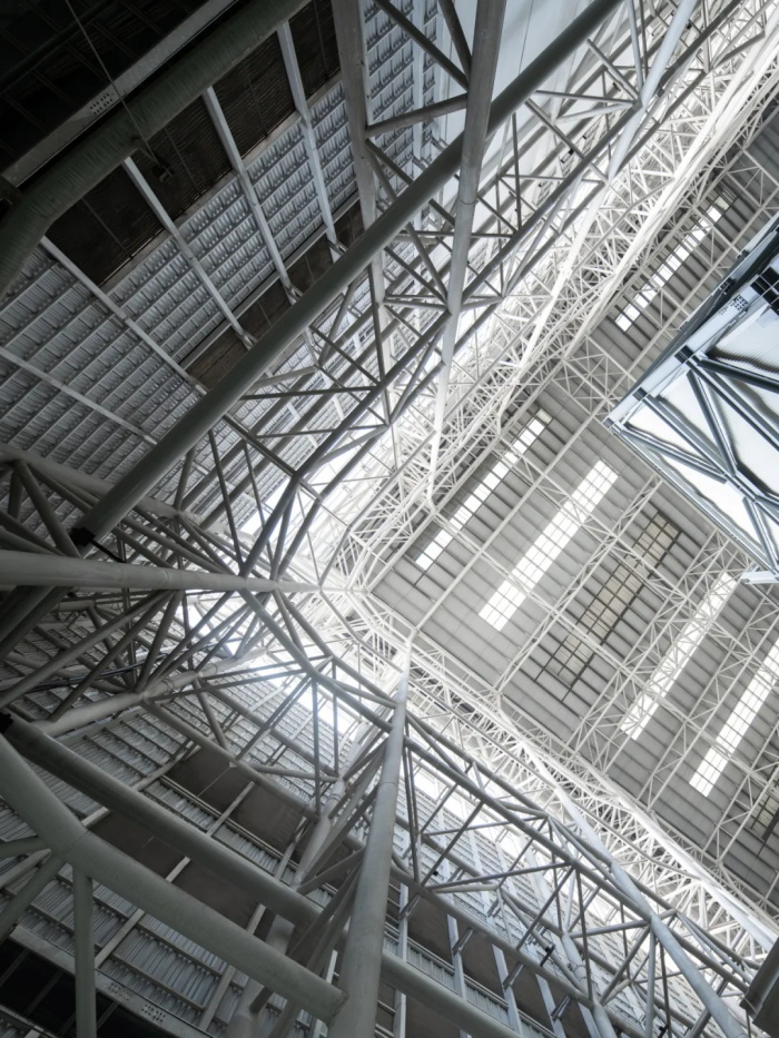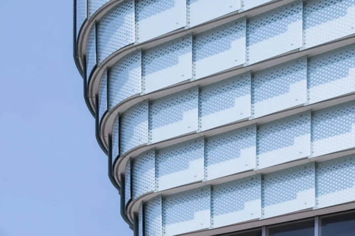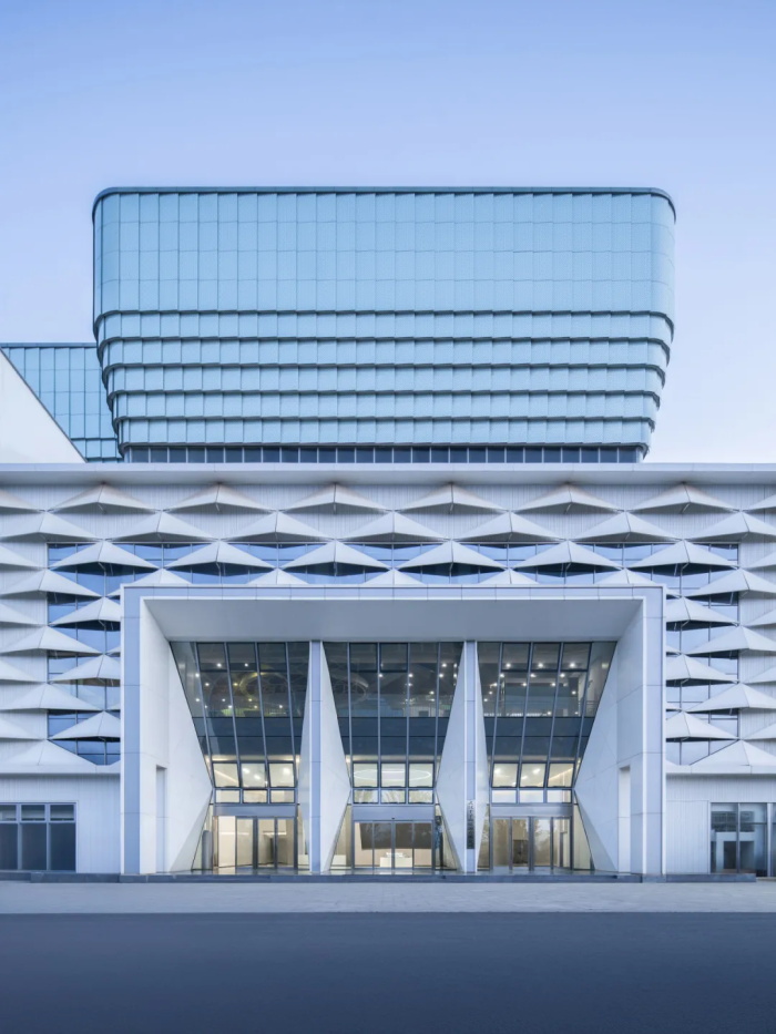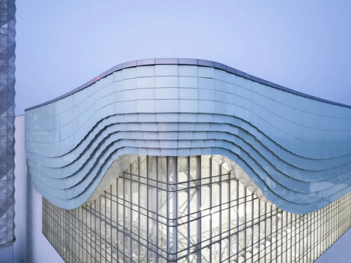 厂房裙房部分采用双层表皮,兼顾开窗的灵活性与立面的整体性。内层表皮为气候边界,由波浪形铝镁锰板和玻璃幕墙组成,根据内部功能需求灵活开窗。外层表皮采用半镂空式铝板幕墙,满足消防与通风需求,并以三角折板为基本单元,形成弯折起伏、明暗交替的节奏感,亦有织物一般的肌理。