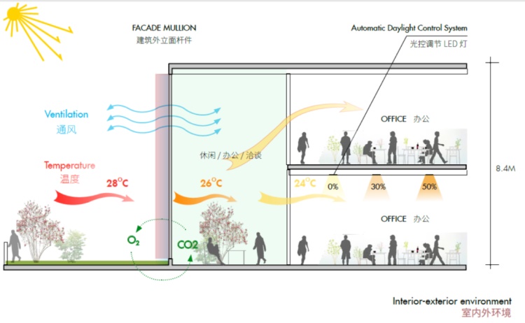 博埃里建筑设计事务所此次的设计目标是将大自然带回人类的日常生活,为了应对城市飞速发展对绿色空间造成的减少,设计旨在以全新的互动方式将拥挤的城市环境和大自然完美的结合起来。同事充分考虑深圳当地气候条件,通过适当的建筑空间组织和设计,提供良好朝向和遮阳通风的室内外空间,最大限度地利用自然通风和采光以降低能耗。