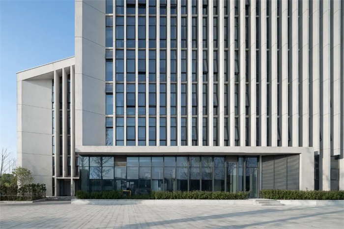 纵向条块在南侧保持齐平,北侧平面根据路型进行斜切和转折的变化,屋顶则通过高低起伏的折顶将几大功能体块组合成一个整体,南北立面再覆以间距、进深不等的混凝土竖向百叶,强调建筑的整体性和标志性。
