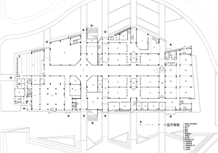 为解决图书馆、行政楼、风雨球场三大功能块的交通和动静分区问题,建筑师在三者之间设置了一个中心共享交通体,通过这个开放式综合门厅进行分流来解决复杂流线的问题,同时将“动”的风雨球场和“静”的图书馆严格分隔开,避免相互之间的噪音干扰。