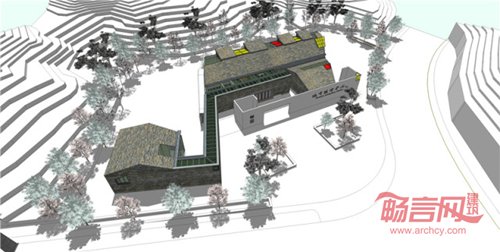 游客中心的设计尝试导入这种控制模式作为空间成型的生发机制——三列功能平行带均采用了单元同构的方式,平面均以类“L”型的衍生方式完成各自的空间构成:直面交叉口的条带一,空间类别为“院”,通过折转围合成院,通体白色粉刷,是入口过渡空间;条带二地处基地最长地段,空间类别为“巷”,在利用地形进行拉伸扭转后,在北端绕出一方小功能组,通体石头砌筑,曲折通幽;条带三体量最大,空间类别为“堂”,为游客中心主功能区,内部亦遵循平行方式进行功能分区,且在靠近条带一与条带二的南侧端头刻意做了个“L”型的突然转折,由此将三个条带咬合成一整体,将平行控制模式无精确边沿界限的状态调整为以某种特定的场地结构作为收束。这种功能单元同构+平行复加的组织模式,既保持了列与列之间相对的独立性,亦获取了平行组合所具有的匀质性与整体性,因而透射出重复性与差异性共存的乡土空间控制思维。