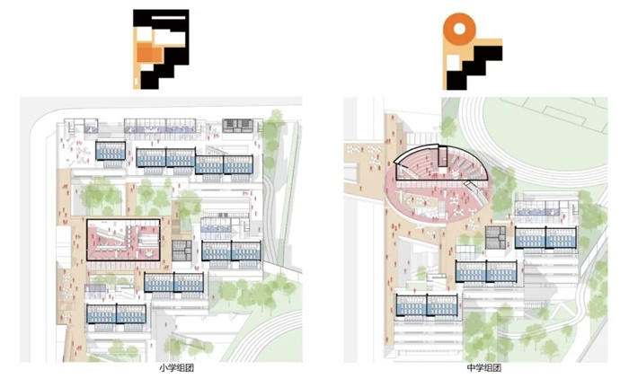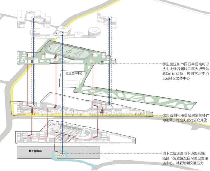 中小学组团分置南北两端:北侧小学,南侧初中,共享中间的运动场。小学和初中设置各自出入口。西侧为学校资源中心共享功能体,并与社区文体中心相连,未来可形成校社共享的公共系统。