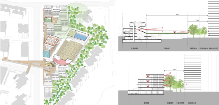 方案充分利用校园东西两侧最长界面,形成差异化双重界面。西侧以中小学图书馆、音乐、艺术、展览功能形成资源中心,构成界面完整连续、错落有致的文化村屋,形成具有活力和艺术气息的城市界面。东侧以运动场、口袋折院和保留树木形成与住区过渡的柔性绿色友好界面。