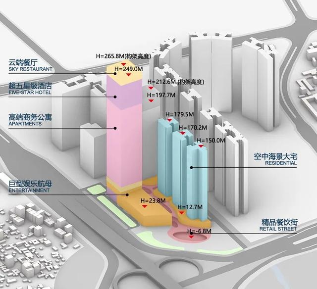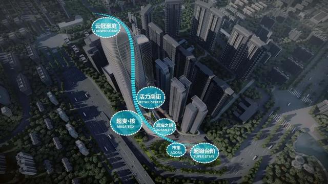 项目集五星级酒店、空中海景公寓、时尚购物街、活力休闲广场多种业态于一体。地块呈东南朝向的长方形,设计基于湛江东南季风气候及场地日照考量,采用双排平行式布局。其中3栋住宅塔楼及1栋酒店式公寓位于北侧,充分利用公园景观及无敌海景;超高层酒店及商务公寓位于西南侧,沿乐山大道形成展示面;整体布局为东端城市主干道交汇处退让出足够空间,营造开放的空间节点。