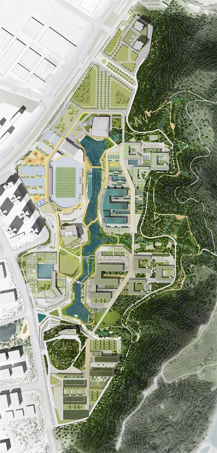 设计最大限度地保留了自然本底,依据山体原始地形的汇水路径,留出海绵绿廊,成为山水校园的生态骨架。根据该骨架,校园被划分成六个尺度紧凑、功能复合的聚落组团,学生的日常学习、科研和生活得以在五分钟步行圈内实现。