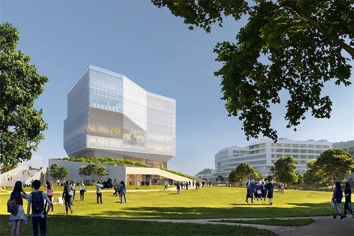 围绕着中央水轴,从北向南依次布置着体育馆、图书馆、国际交流中心和综合楼等公共建筑群。理性高效的设计语言与自然的生态环境有机结合,折叠的建筑主体于地景中自然隆起。