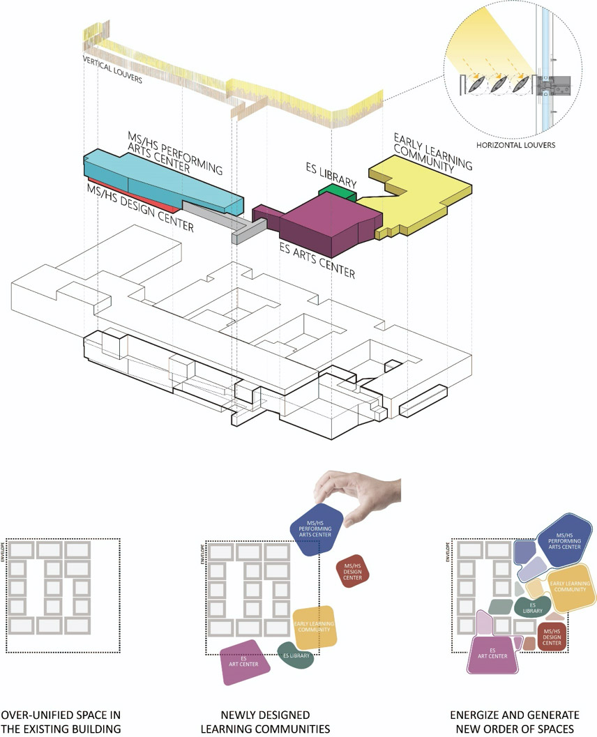 作为启动整个校区升级的试点项目,改扩建设计包括五个小型学习社区,每个社区根据不同的学生年龄和课程,采用了截然不同的色彩和场所塑造。这些创新空间将刺激整个学校的新陈代谢,使之随着新兴学习社区的介入而不断进化。