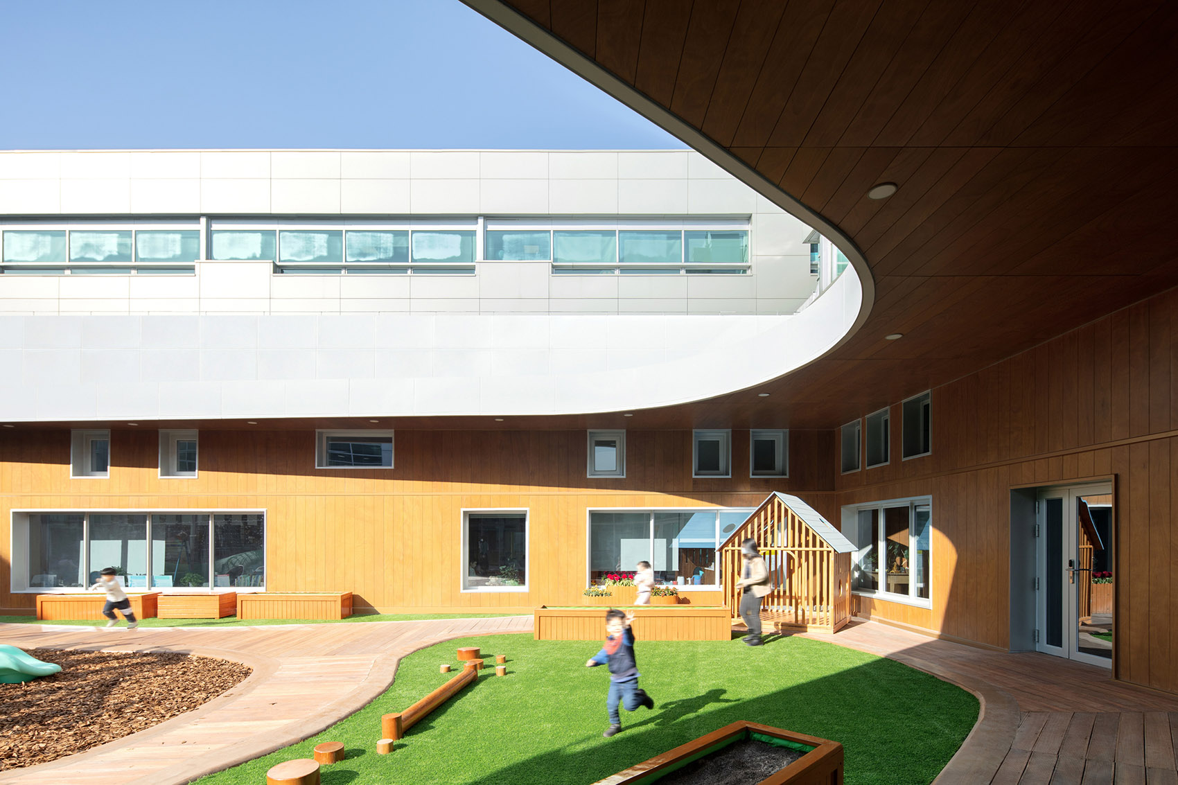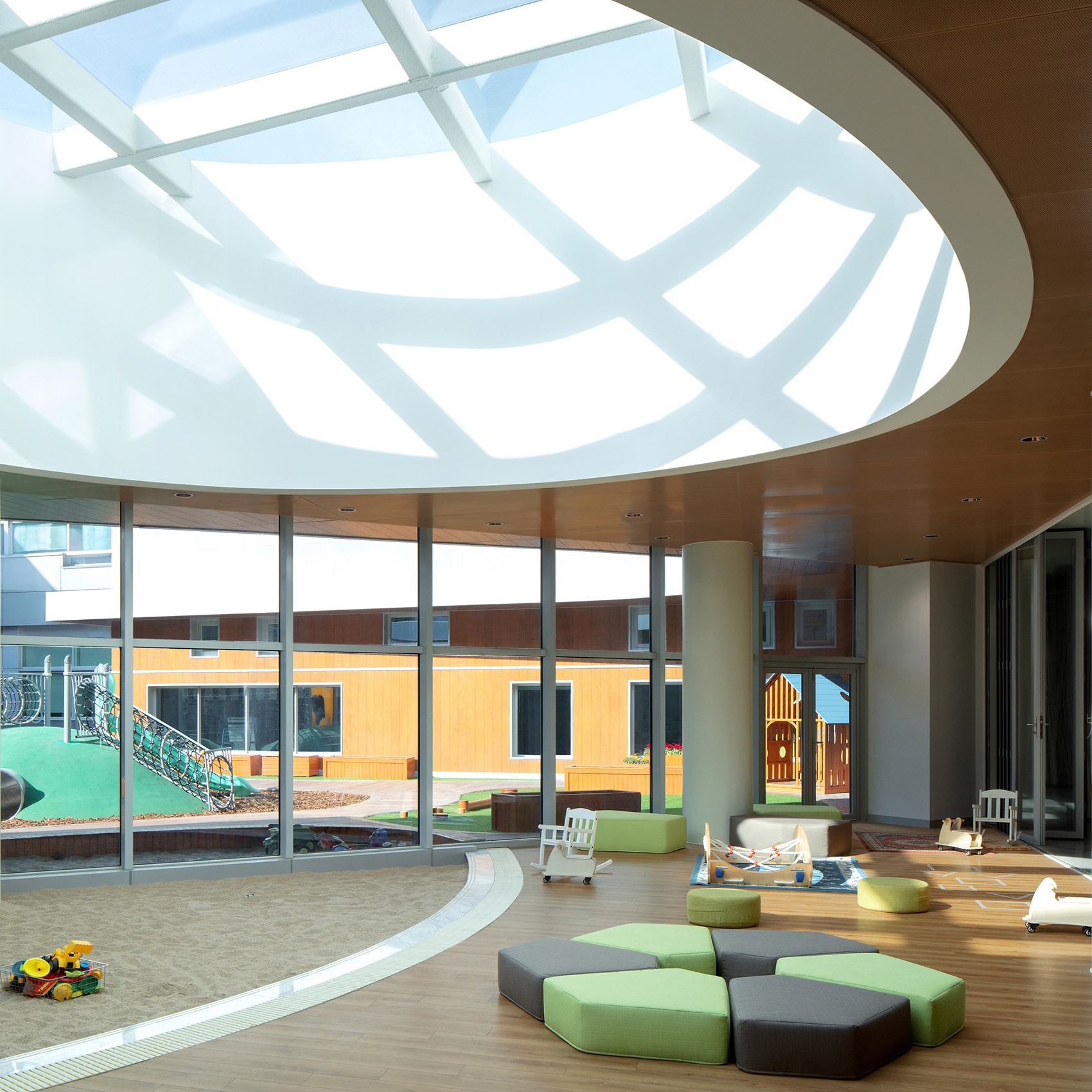 早教社区采用瑞吉欧教学法,其设计旨在为孩子们创造一个宜人并且真实的探索世界。扩建的内院以温柔的屋檐线勾画,将高大严肃的教学楼推到了孩子们的视线高度之外,并为原本清冷的庭院增添了趣味和亲和力。