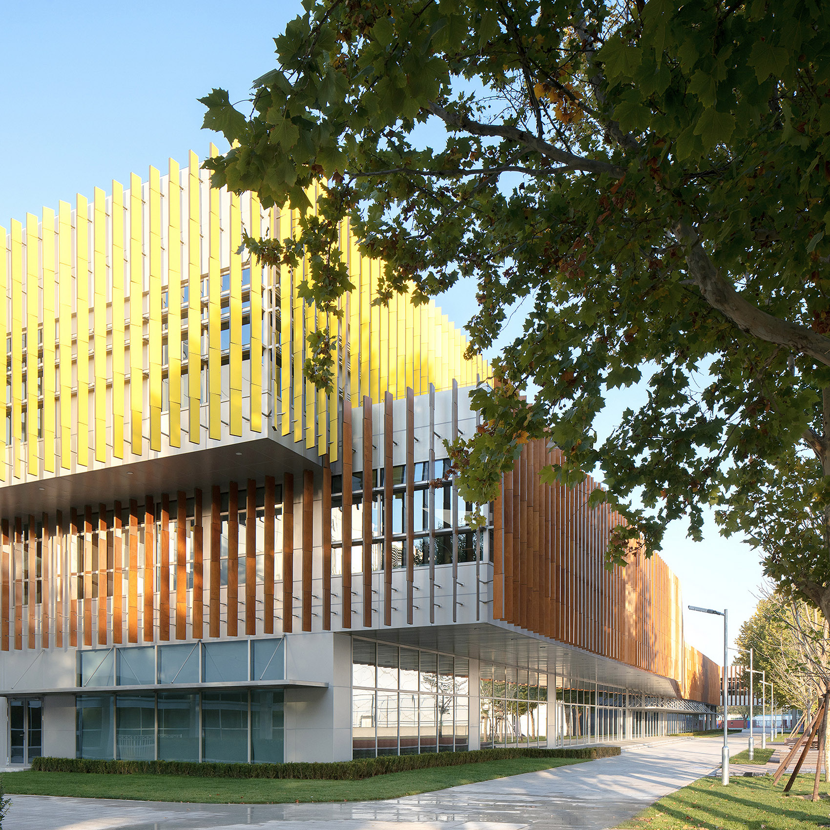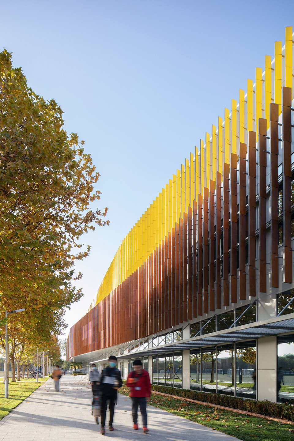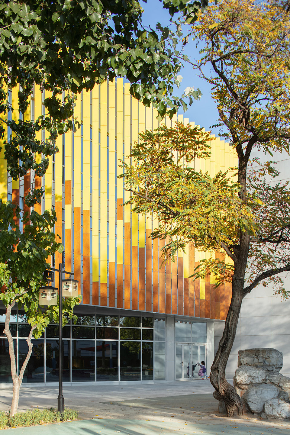 扩建建筑沿着现有建筑的东边和南边蜿蜒而行,丰富多彩的学习空间包裹在温暖柔和的外墙中,与原建筑严肃的外观对抗平衡,并在新旧交接中包容了年龄、时间与文化。垂直遮阳板由天然木贴面树脂板和彩色千思板构成,以阻挡过多的阳光,降低能耗。小学艺术中心的遮阳板将色彩混合,好像调皮的小朋友将黄色油漆滴在了木板上。中学表演艺术中心的遮阳板角度看似随机,在阳光下呈现出不同的色调,实际上是设计师提取了一段乐章的旋律由软件编制而成。木色遮阳板代表着低音,黄色遮阳板象征着高音,二者共同构成一曲优美的二重奏。