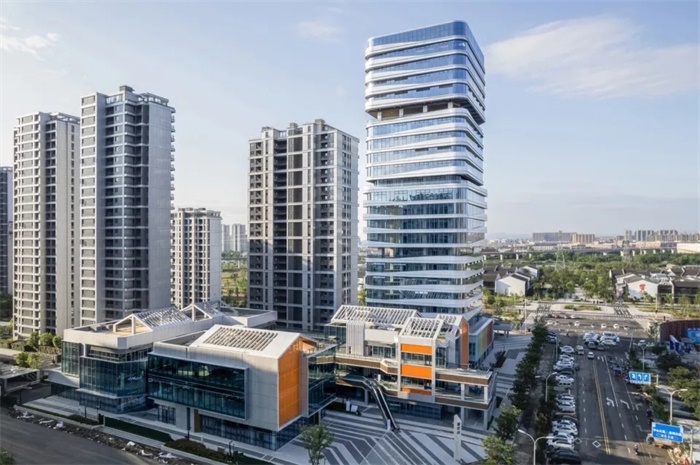 新希望台州总部办公楼位于浙江台州椒江的新城片区,坐落于学院路南北轴线最南端,周边多为近两年动工在建中的住宅小区与。自浙江省从2019年提出“未来社区”的概念以来,空中景观和最大化绿色空间成为该片区建筑规划的必要条件。如何和周边建筑既形成呼应,又拥有一定的地标形态,同时创造符合城市规划纲领需求的生态空间,成为了设计主要的难点与研究方向。