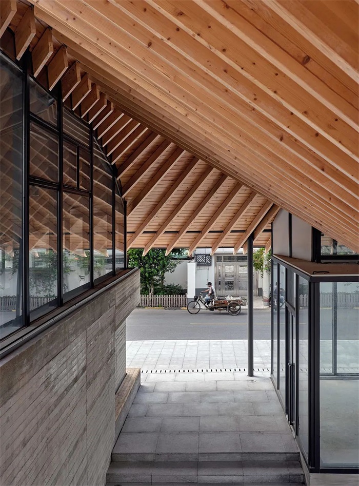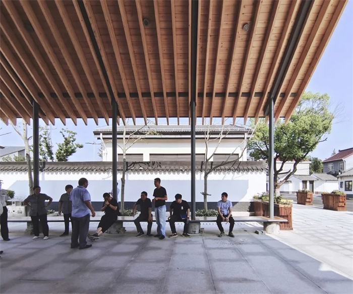 有别于传统展览建筑的围合封闭,新建展馆相对自由开放,为老城厢市民提供休憩、遮荫、演绎、会友等多功能活动场所。在西南角设置市民驿站,串联在主展览流线之中,吸纳城市活力,丰富和提升使用体验。