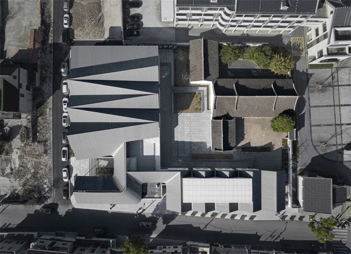 扩建建筑围绕县委旧址呈 L 型布局。在满足保护建筑各项要求的前提下,新老建筑之间围合成六组连续融通的庭院空间。内向院落用以容纳不同的户外展览交流活动,如少先队宣誓活动等;外向院落为市民开放,日常共享。设计将建筑群主入口调整至基地东南角,挑空的入口檐廊呈现新旧关系的同时,也方便组织交通、为街道提供邻里友好的等候场所。