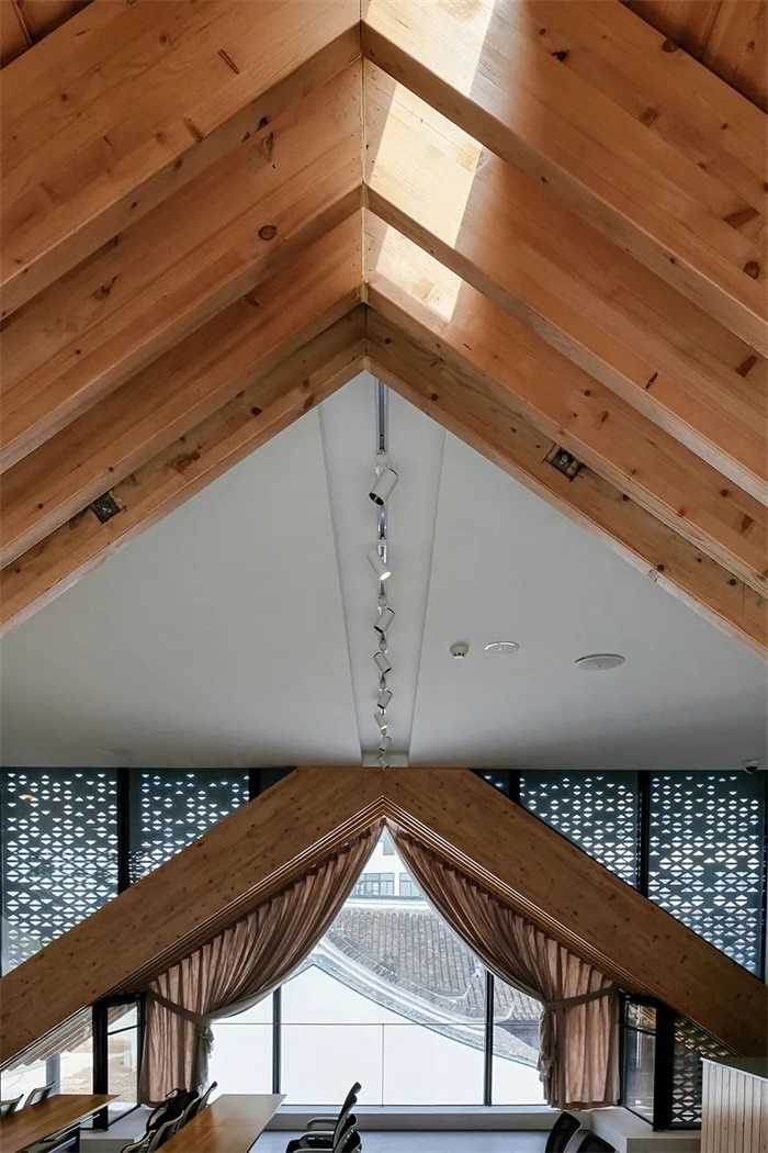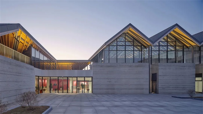 南侧建筑群以钢木结构为主要受力体系,旧址的梁架结构通过现代建造技术演化,连绵起伏的屋檐与序列有秩的柱廊相得益彰。西侧建筑群以钢结构为主,为满足展览跨度需求,顶部形成完整的空间网架;两侧檐口对位交错,回应场地。角部“纽带”钢木混用,曲径通廊,完成西侧及南侧的结构衔接与转换。