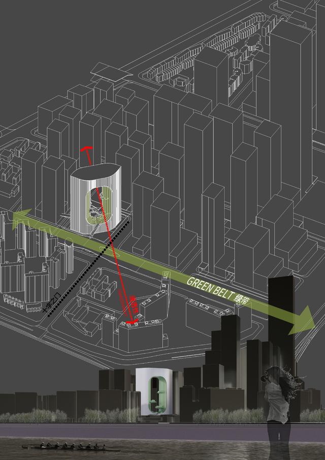 总部办公与租赁办公各设一栋,便于管理。商业与地铁站点、公交站、空中漫步道、绿廊密切连接,形成完善的立体街道系统。并通过穿梭梯将公众送到位于顶层的文化展示空间,最大限度增强空间对市民开放、增强品牌认知。充分体现深超总鼓励交互的城市设计思想。