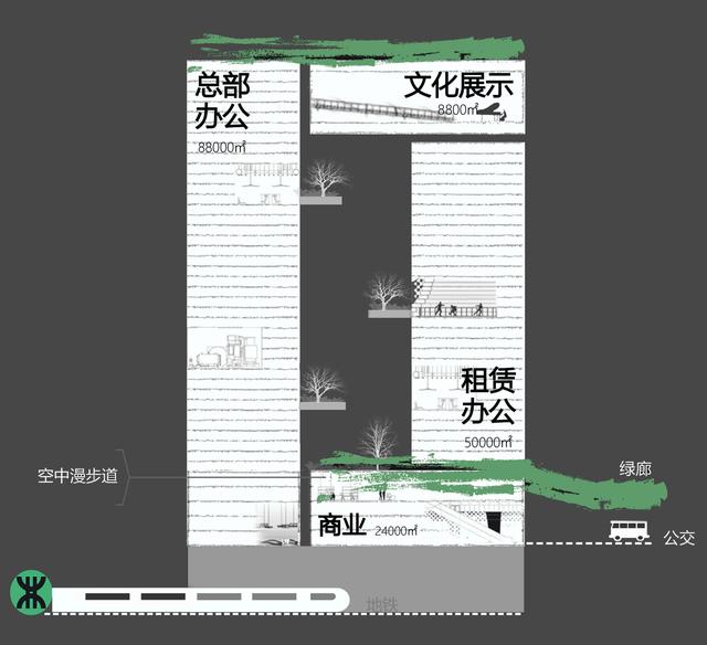 露天商业街道与办公大楼分开管理,然而又能和绿廊、地铁及空中漫步道系统融合,最大限度引入人流,实现有活力的立体街道空间。
