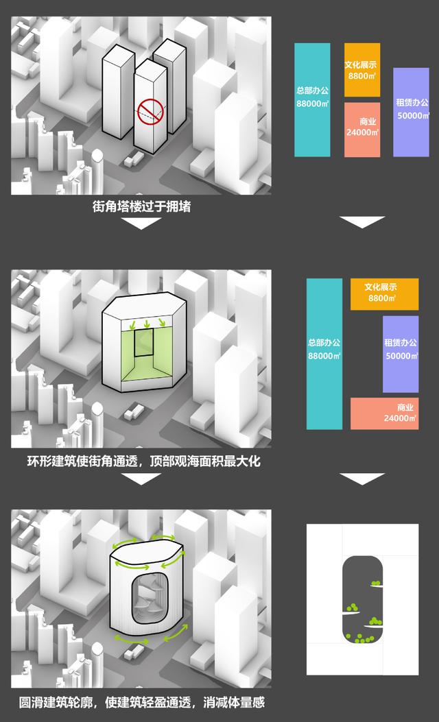 将原本堵住街角的塔楼体量一分为二,令环境条件优越的高层面积最大,享受最佳海景。建筑获得整体感和标志性。避开临近塔楼遮挡,也为街区形成通透的空间格局和欢迎姿态。