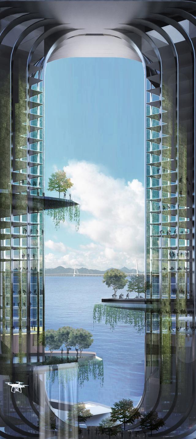 整体项目呈现简洁现代的银白色,与深超总未来城市的风格契合。巨大的绿色窗口形成绿廊上一个立体的节点。适宜南方气候的植物和垂藤从地面逐渐升起,成为漂浮平台上的绿洲。为办公人群提供海风拂面的休憩交流空间。屋顶的空中热带雨林成为绿色的制高点。
